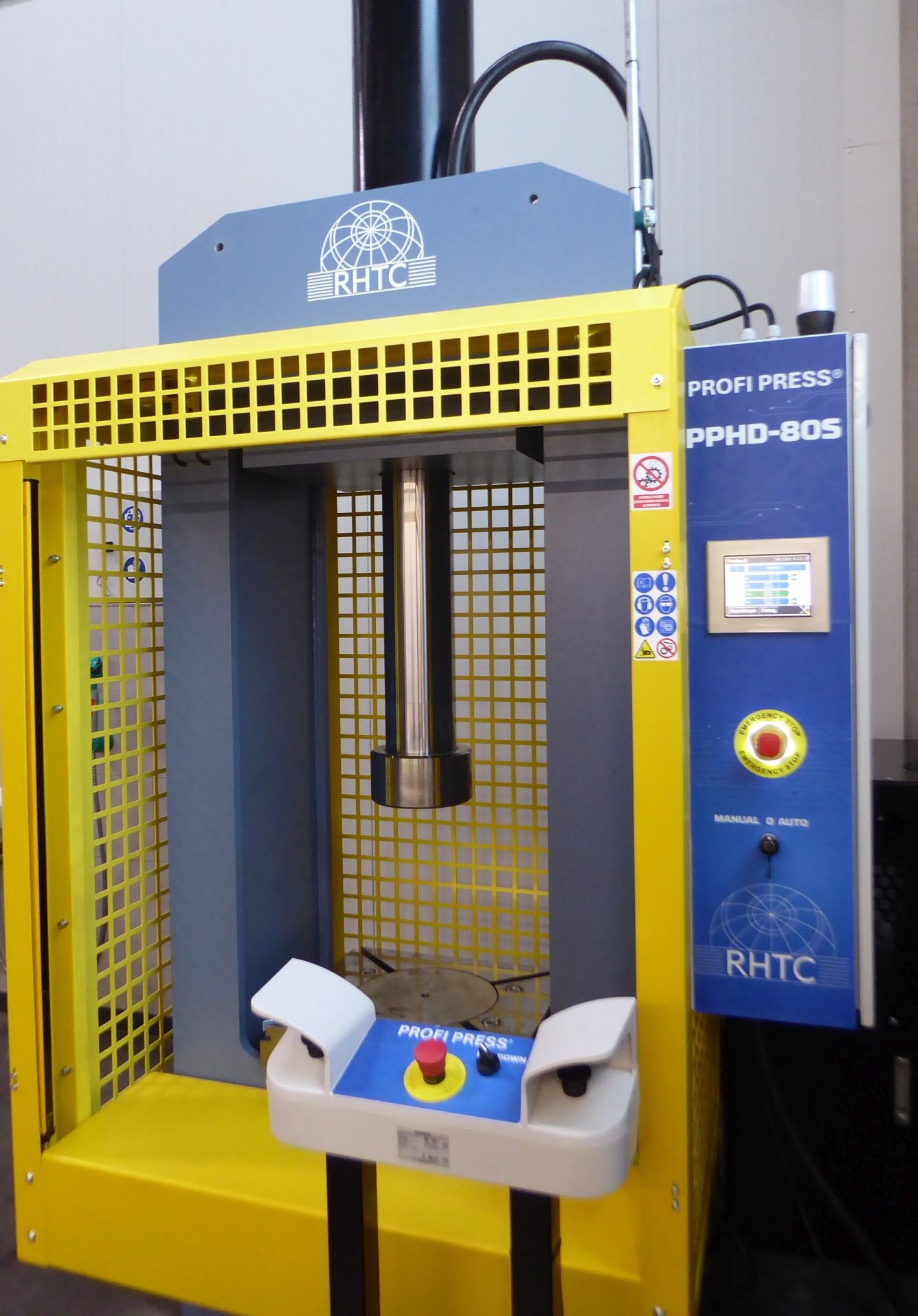 Diese 80 Tonnen Hydraulikpresse verfügt über einen Drehknopf zur Regulierung der Arbeitsgeschwindigkeit (0,1 bis 9,2 mm/s), während die An- und Rücklaufgeschwindigkeiten fest eingestellt sind. Mit der NC-Steuerung kann der Kunde den Kolbenhub (min., max. und Schaltpunkt) sowie den Druck und die Haltezeit festlegen. Die Maschine ist mit die Zweihandbedienung ausgestattet und mit einem speziell angefertigten Tisch (inkl. Bohrung und Abdeckung) ausgestattet, der das Durchpressen von Material ermöglicht.