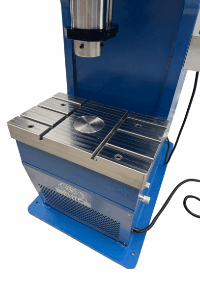 Notre presse à col de cygne de 100 tonnes a deux modes de travail : manuel et semi-automatique. Sa table est équipée de rainures en T et d’un trou central : les déchets issus des opérations de perforation peuvent tomber librement par ce trou dans le bac de collecte. Le réglage de la vitesse et de la force de pressage peut être effectué à l’aide des valves de réglage hydrauliques. De plus, la presse est également équipée d’un manomètre.
