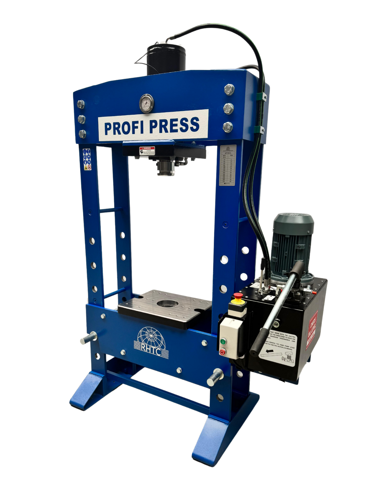 Our 60 ton workshop press can be delivered with a fixed cylinder (60 Ton M/H-2) or a movable cylinder (60 Ton M/H-M/C-2). All our workshop press models have an in-height adjustable working table (motorised). Equipped with pressure regulation, manometer, 2 speeds and a directional control valve to move the piston up and down. With this valve you are able to move the piston precisely, which makes this hydraulic press perfectly suitable for precision tasks. Additionally, this workshoppress is equipped with a hand pump for manual pressing jobs.